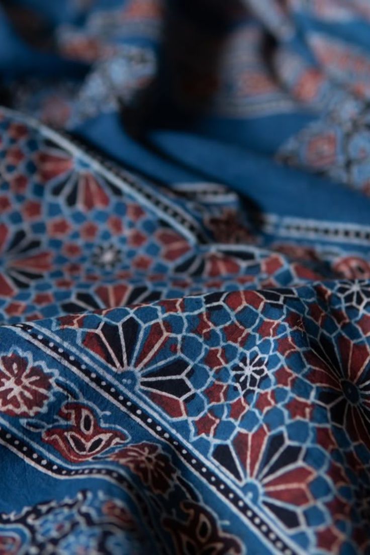 Clamp Ajrakh sarees are crafted using a traditional resist-dye technique where the...